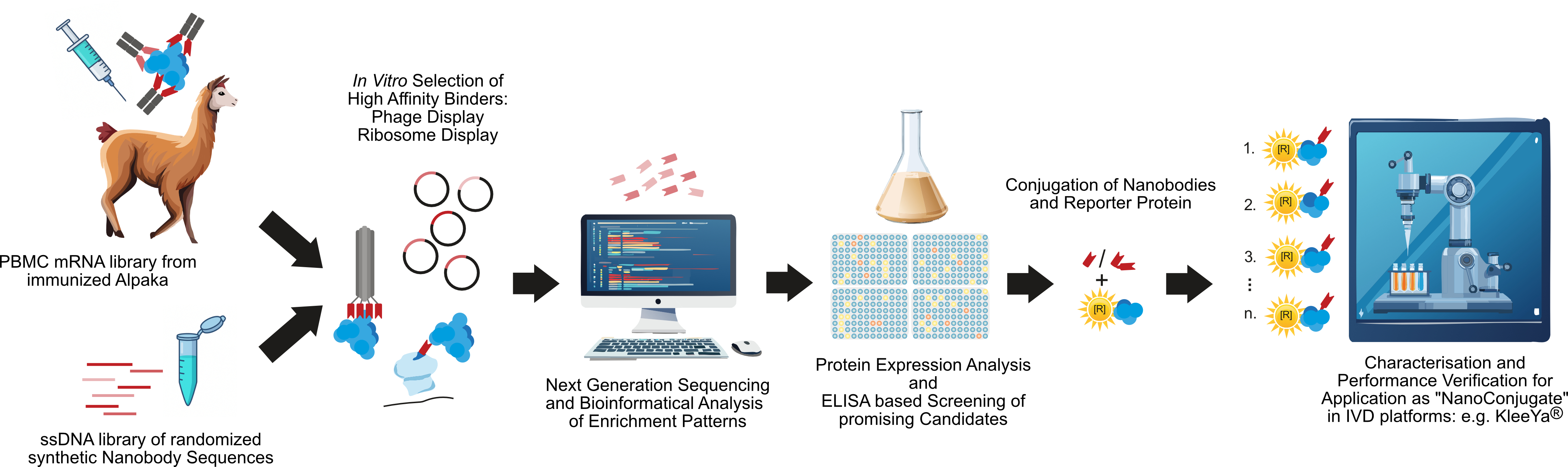 OurNanoConjugates were evolved in a multi-level in house selection process starting with cDNA libraries from immunized alpaka PBMC cells or a random single stranded synthetic DNA library coding for the variable domain of heavy chain only antibodies. The processing included multiple rounds of in vitro selection or more precisely phage and ribosome display for enrichment of putative binders to the adressed target antibodies and Next Generation Sequencing as well as bioinformatical analysis of enrichment patterns. Promising candidate pools were screened for their ability to bind human serum antibodies in an diagnostic ELISA assay and the best performing ones were further characterised by protein expression analysis. As reporter module, we linked a discrete protein module with either acridinium or horseradish peroxidase. The final constructs were validated regarding their applicability in IVD platforms, such as LineAssay or bead based automated CLIA.